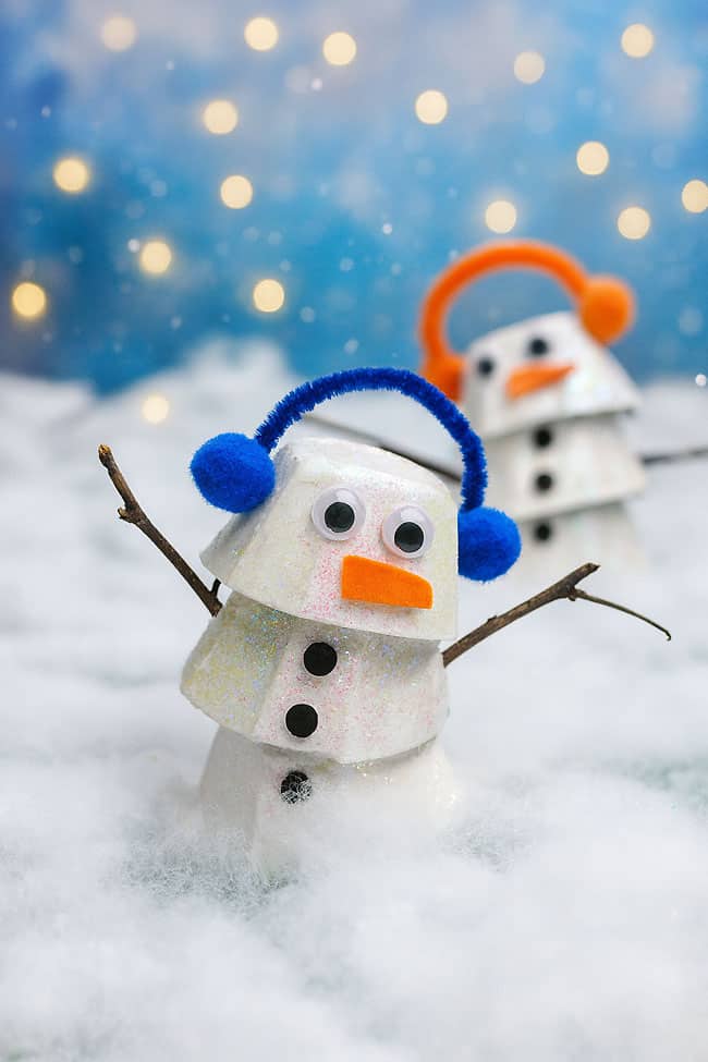 Turn an everyday recycled egg carton into this super cute snowman craft! This egg carton snowman is the sweetest little winter project — easy enough for kids, but still fun for adults to help with. With a bit of paint and a sprinkle of sparkle, simple egg carton cups turn into an adorable snowman with tons of personality!